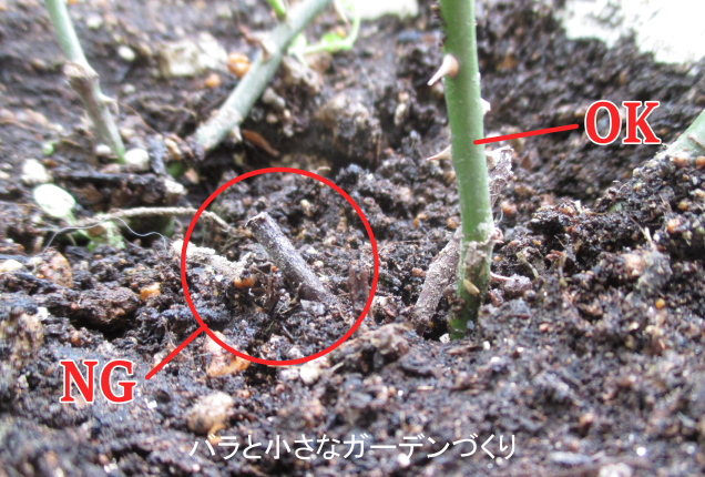 葉が落ちてしまったミニバラは、もう復活しないと捨ててしまう方も多いでしょうが、枝がまだ緑色なら復活させられる可能性が高いです。上の写真の右の枝のように瑞々しい緑色をしていれば、まず復活させられます。でも、左側の枝のようにカラカラに干からびて茶色くなってしまっては、もう助かりません。黄色い枝でも復活できる可能性は低いです。