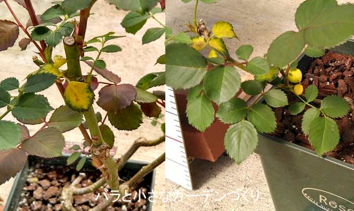 どちらの株にもチラッと黄色くなった葉があります。葉先に黒い斑点があるので、完全に黒星病ですね。
