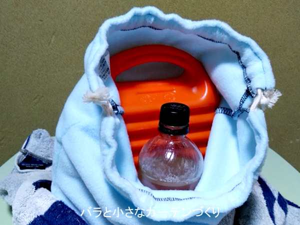 500mℓのペットボトルに培養液を入れて緩くキャップをし、立てた湯たんぽと一緒にタオルで包んで培養します。