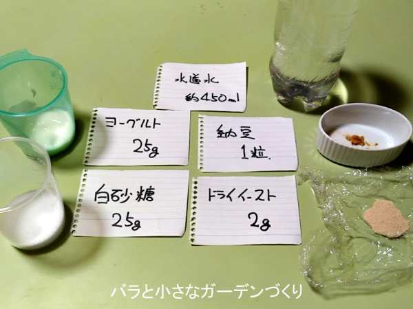 バラの病気抑制には、納豆マシマシで散布液を作った方が良いということで、4月下旬に納豆2種類それぞれ10粒、合計20粒を入れた「納豆マシマシえひめai-2」をつくりました。納豆菌にも種類があり、なるべくメーカーの違うものを混ぜた方が良いという情報があったので、2種類の納豆を混ぜています。