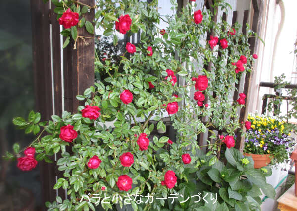 我が家のリビング前の木製アーチに誘引している「紅玉」は、花径4cmほどの半八重咲きの花をコロンと球形ぎみに咲かせるつるバラです。