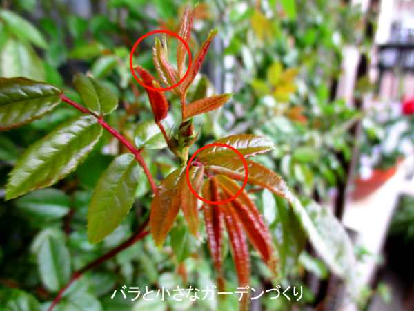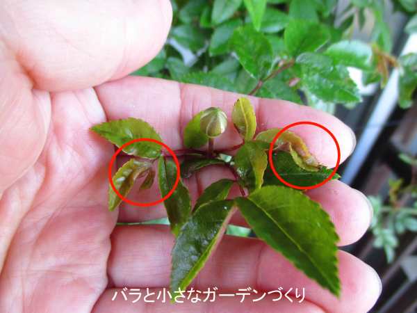 ▲蕾まわりの若葉にウドンコ病の兆候