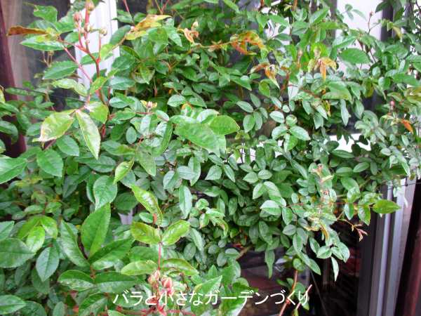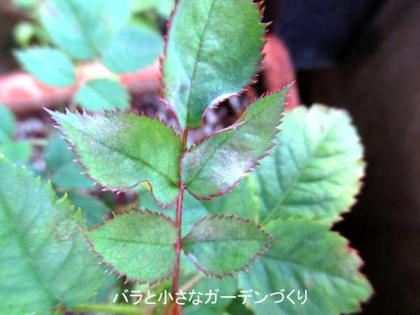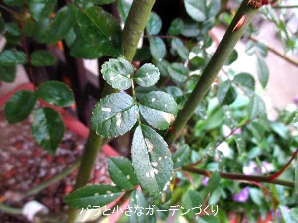 このバラは我が家の一番乗りでウドンコ病にかかった株です。ごく初期に除菌ウエットティッシュで拭きとったあと、またウドンコ病が再発してきました。
