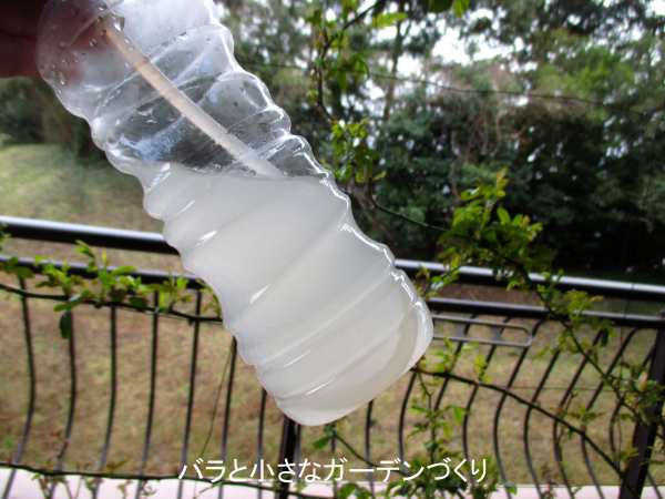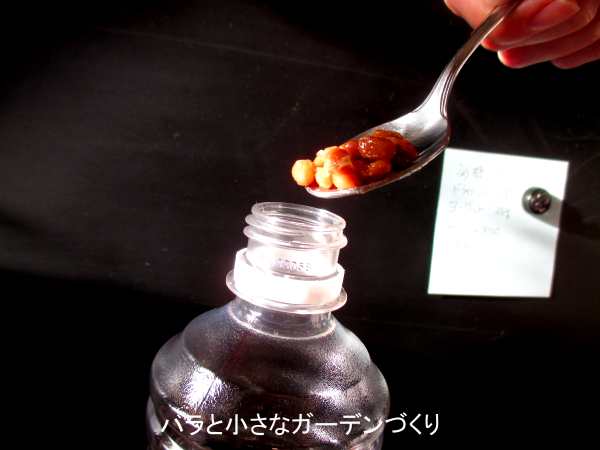 最初の散布なのでまだ要領がつかめず、このときは納豆菌液を培養せず、納豆・ドライイースト・砂糖・ヨーグルトを混ぜた上澄み液を水で薄めて散布しています。──これだとヨーグルトの薄め液ですね(^^;