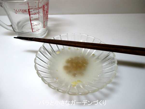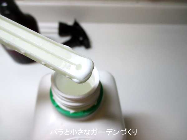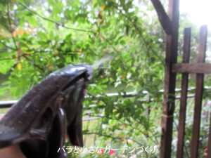 100mℓで作った場合、納豆液が濃いので上手く霧状に広がらず、細く出てしまいます。少しやりにくいのですが、我が家の場合つるバラは1株だけなので、濃いままスプレーすることが多いです。