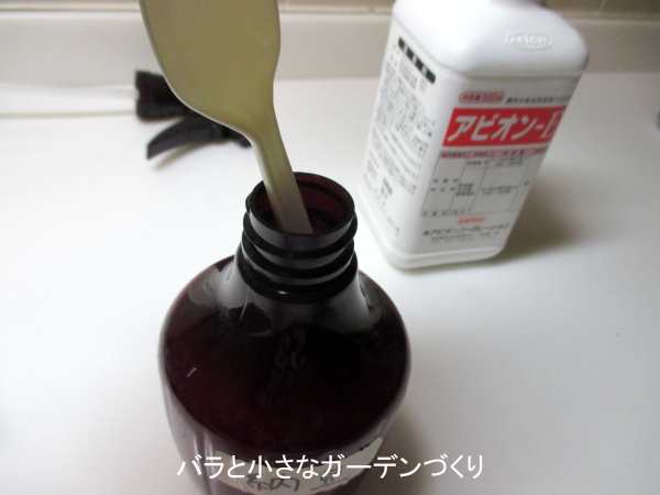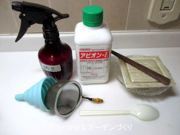 4、アビオンE/「納豆スプレー」がしっかり葉につくように混ぜるパラフィンを主原料にした「展着剤」です。ごく少量しか使わないのに500mℓの商品しかなく、1000円以上しますが重要な材料です。1本用意してください。