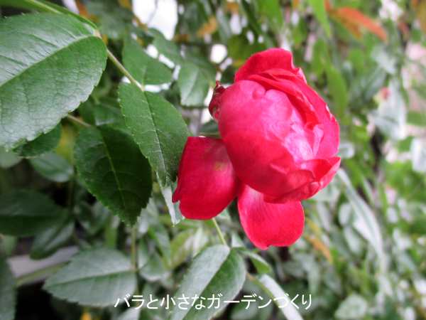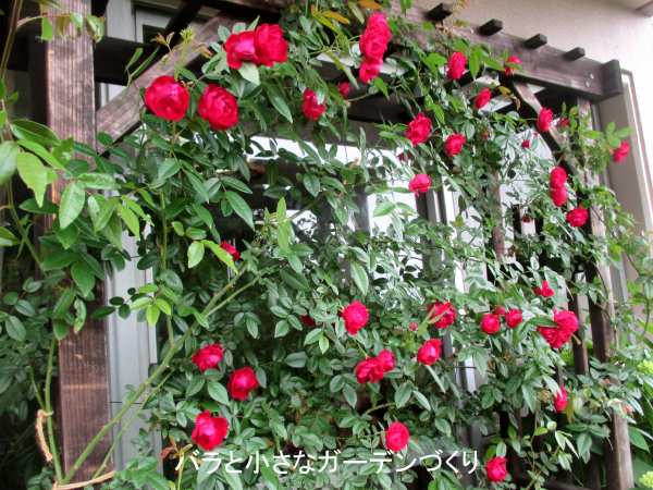 我が家のリビング前に設置した木製トレリスに誘引しているつるバラの「紅玉」が今年も咲きました。コロンと球形に咲く黒赤の花は派手さはないけれど、シックな趣があり、お気に入りの品種です。