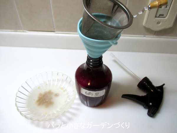 スプレーボトルにミニじょうごと茶こしをセットして、納豆液をスプレーボトルに移します。