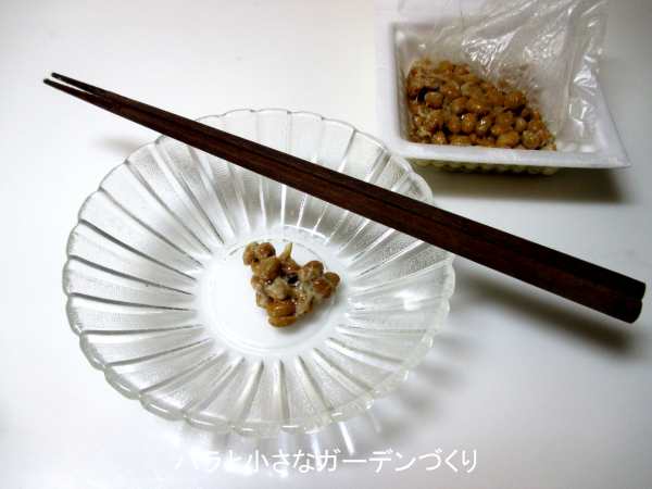 小さいハンドスプレーの半量(100mℓていど)の「納豆スプレー」を作るのに、納豆は小さじ1杯ていど使います。これを深皿に取り、箸でよく混ぜて、しっかり粘り気を出します。