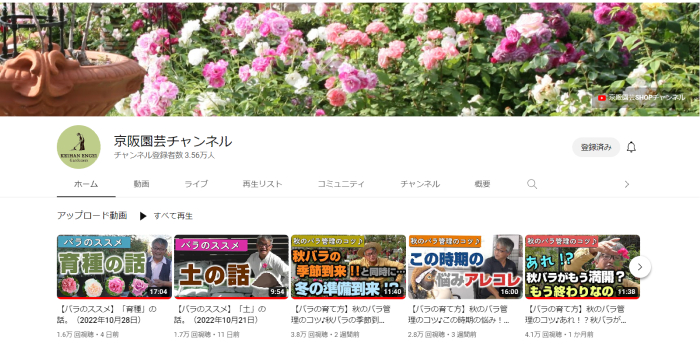 そしてなんと小山内健先生の「京阪園芸チャンネル」は毎週更新です。さまざまな視点からバラの育て方を惜しみなく教えてもらえる、ロザリアンにはとてもありがたいチャンネルです。