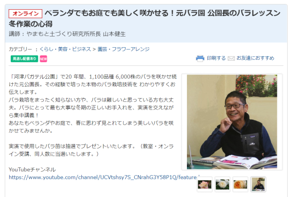 バラの育て方講座は、静岡県の河津バガテル公園の公園長を20年間務めた山本健生さん(やまもと土づくり研究所所長)によるオンライン講座があります。