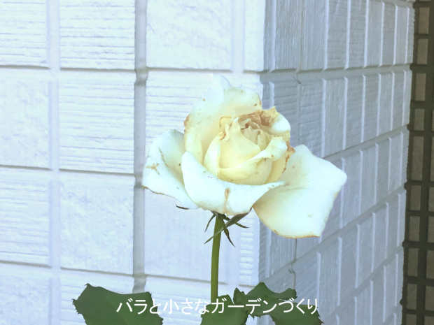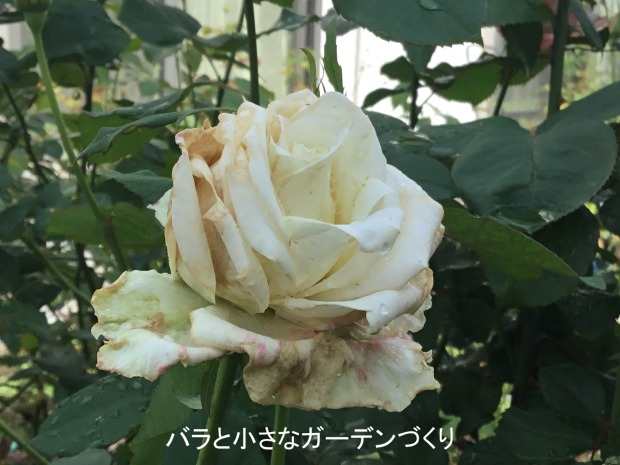 雨で花びらが痛んだけれど、クリームがかった白い花が形よく開花しました。ステムが長く切花向きの花です。花径8cm。香りはワイルドなノイバラの香りがします。少し鼻をつく、野趣あふれる香りです。