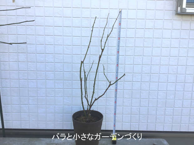 樹高60cmに弱剪定しました。枝数が多くないので、細い枝も残しています。今年は花よりも根の充実を優先したいです。