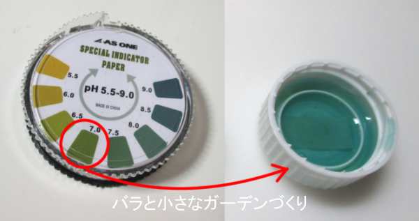 検査結果は上のとおりです。レディエマハミルトンは青アジサイとピンクアジサイの土の中間の色なので、PH6.0です。バラのPHは6.2が適正なので、もう少しアルカリ寄りでもいいのですが、まぁこれくらいなら誤差の範囲でしょう。