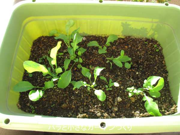 驚いたのがルッコラの土。この色からするとPH5.5か、もっと低いかも知れないですね。リサイクル土を使っているのに、こんなに酸性寄りになるとは! 原因はもちろん雨水でしょう。