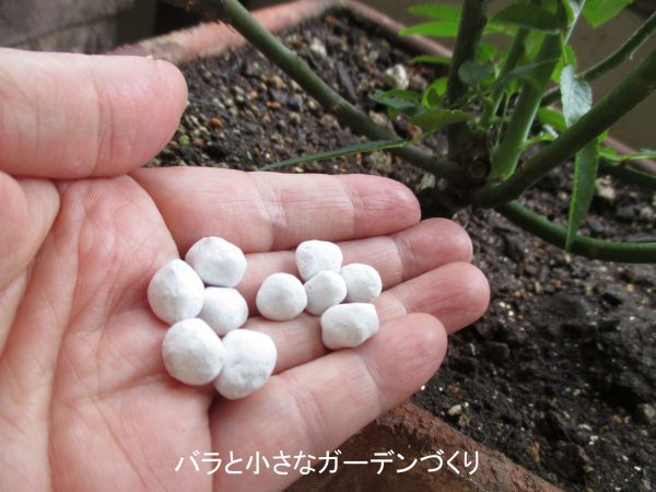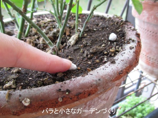 固形の化成肥料をやるときには、バラの株元から離して鉢の縁にバラして置くのが基本です。これは、濃い肥料成分が根を傷めるのを少しでも防ぐためです。ただし、マイローズばらの肥料は根を傷めないよう作られているので、株元に置いても問題ないようです。そこは使う肥料に沿った使い方をしてください。