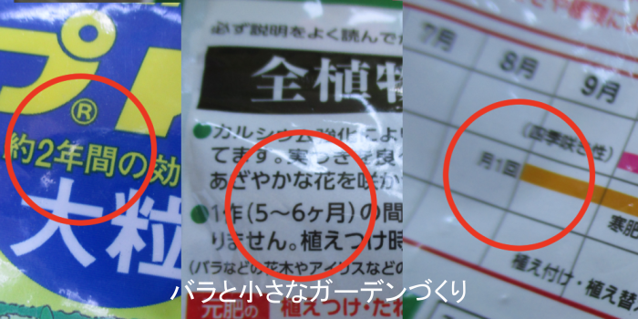 ▲固形肥料では、効果の持続期間を確認して!