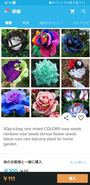 たとえばこれはwishという海外サイトです。希少なミックストカラーのバラの種、レインボーローズの種、盆栽花の種(盆栽花ってなに!?)、黒バラの種(ここの写真にあるような漆黒のバラなんてないから!)が販売されています。どれもこれもツッコミどころ満載です。