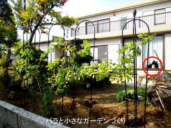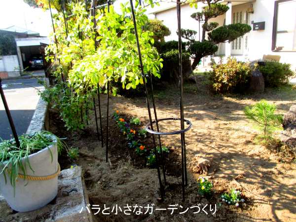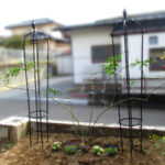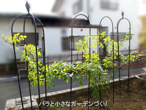 写真左側のオベリスクを、1mほどさらに左に移動し、間に同じオベリスクをばらしたものを2つ立てて長い支柱を横に2本渡しました。