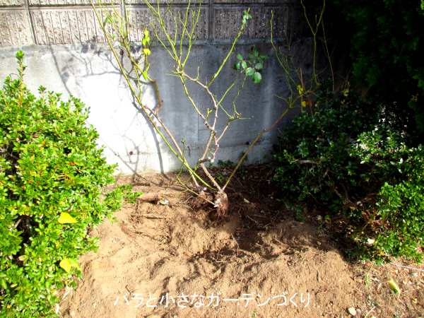 ツルハシで石をかきだし、手で引っ張り出して、小さなシャベルで掘り進め・・・。バラにガッチリ食い込む太根も切ったし、横に植えてあるツツジも刈り込みました。