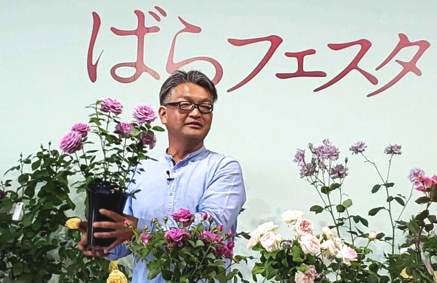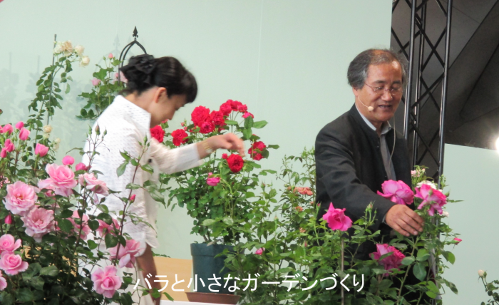 いて、玉置一裕さんのトークショウ「今年のバラはこれ!」のもようをお届けします。ステージ上にはたくさんのバラが集められ、司会進行の吹田明日香さんと一緒にトークショウが行われました。