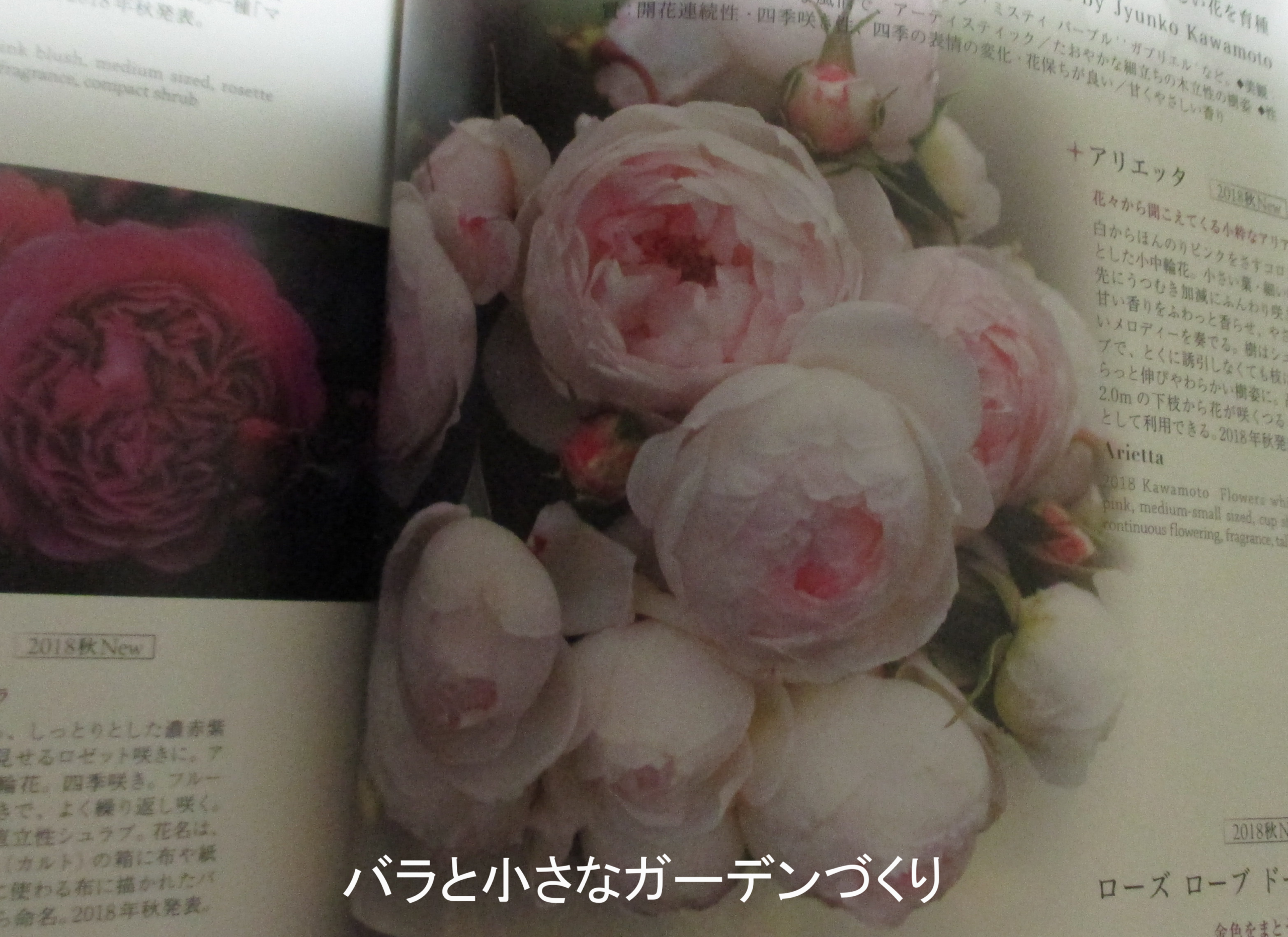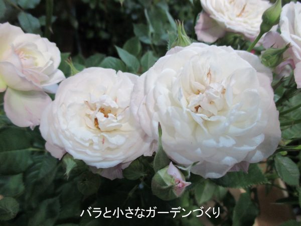 まず最初は、河本純子さんのバラ「アリエッタ」。白からほんのりピンクをさすコロンとした花形の小中輪花です。日本のバラは作りが細かいですね。河本純子さんは、庭で草花とよく合うバラを目指して「控えめな優しさ」をつくりたいと育種しておられます。じつはこのバラ、名付け親は私なんですが。「ガブリエル」とか、これまでいろいろ名前をつけています。