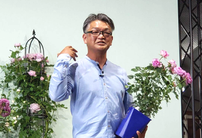 細レポート第3弾は、まずローズソムリエ小山内健さんのトークショウのもようから紹介します。小山内健さんは、大阪府枚方市の京阪園芸に所属するバラの育種家です。軽妙なトークで場を盛り上げながらバラの世界を紹介してくれる小山内さんの講演は、いつも楽しくて時間を忘れてしまうほど。そこは、さすが大阪の園芸会社所属の方ならではですかね!