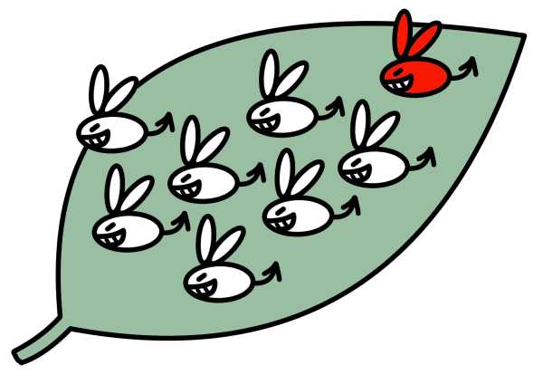 アブラムシをほぼ退治しました。でも、1匹だけ赤いアブラムシが残ってしまいましたね。じつはこの赤いアブラムシは突然変異で、殺虫剤Aに耐性があります。