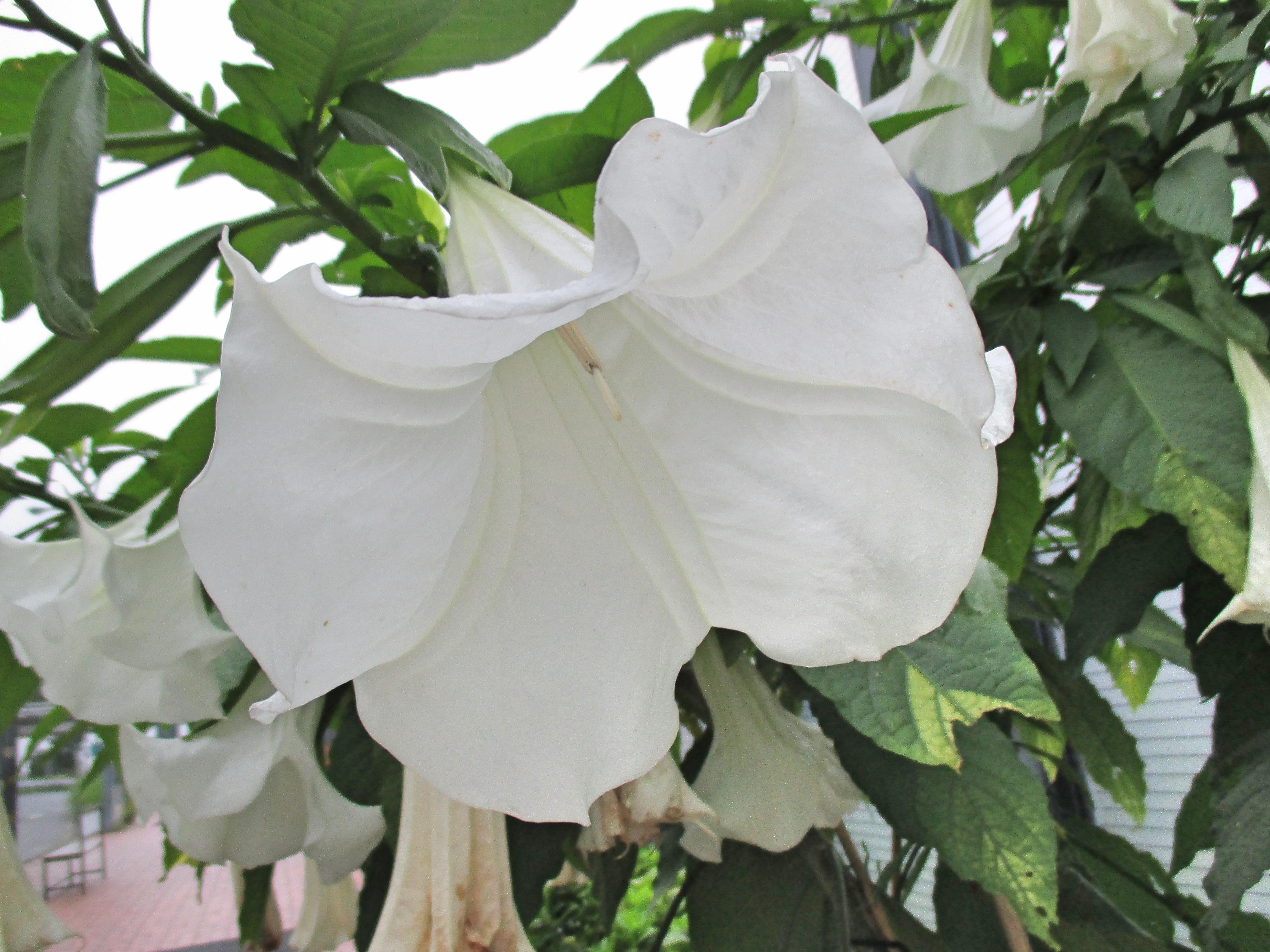 キョウチクトウ、ジギタリス、スズラン、ヒガンバナ、イヌサフランなど、花はきれいでも強い毒性をもつ植物はけっこうあります。知っていればいいのですが、このエンジェルス・トランペット、幹線道路脇のバス停横に咲いています。小さな子どももたくさん通る公道なのでちょっと心配です。花の汁がついた手で目をこすっても危ないそうです!