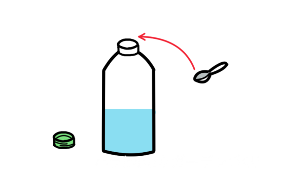 500mlのペットボトルなら10mlの「ハイター」を混ぜます。10mlは、ペットボトルの蓋の一番上のスクリュー線までを2杯です。料理用計量スプーンの小さじ2杯、ティースプーン2杯でも10mlになります。