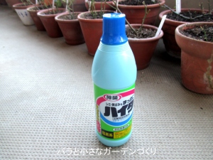 次亜塩素酸ナトリウム0.02%溶液は、1リットルのペットボトルに4mlの「ハイター」を混ぜます。500mlのペットボトルならその半分、2mlの「ハイター」を混ぜます。