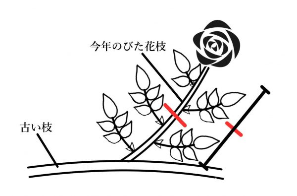 「返り咲き」表記がされているつるバラは、春の1番花の後で図のように切り戻しておけば、切ったところから伸びた枝先にまた花が咲く場合がある品種。シュートの先に花が咲く場合がある品種。どちらも「必ず」花が咲くわけではなく、場合によっては花が咲くことがある品種です。