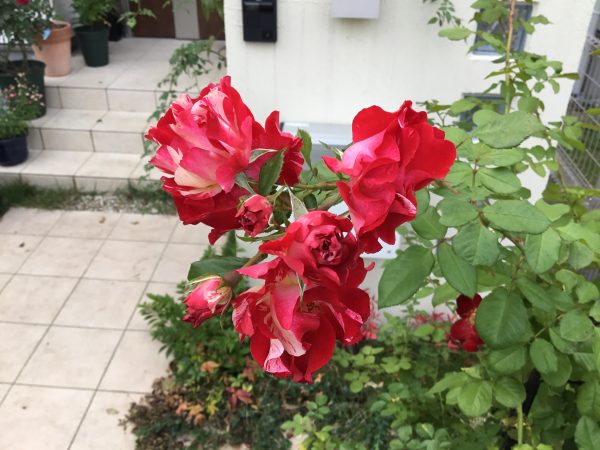 春はすばらしい花つきのシュラブ系統のバラ「スーリールドゥモナリザ」の秋花です。1株に8輪と、花数はそう多くありませんが、葉の状態がよく、赤い花がとても目立ってきれいでした。