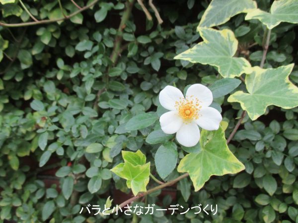 黄色い雄しべがよく目立つ一重咲きのシュラブ樹形のバラ「淡雪」は、「四季咲き~くり返し咲き」表記がされています。秋花は、1株でこれ1輪だけ咲いていました。