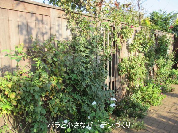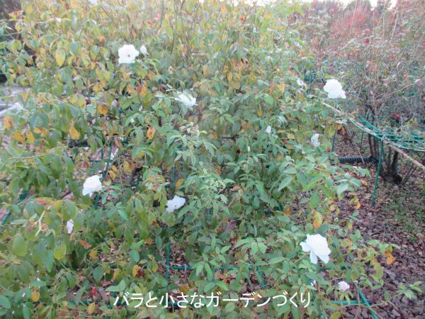 上の写真は、乱れた感じのポンポン咲きがひらひら可愛らしいつるバラ「スノーグース」です。板塀から飛び出した枝を中心に秋花が咲いています。