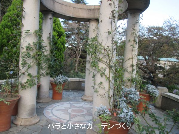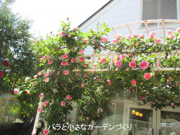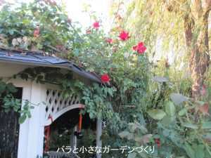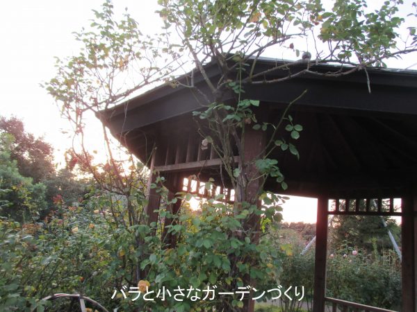 でも樹高をおさえて木立ち樹形に管理すると、もっとよく咲くようになります。写真でも、ガゼボ(東屋)の上の方は咲いていませんが、足元に秋花が咲いているのが見えますね。