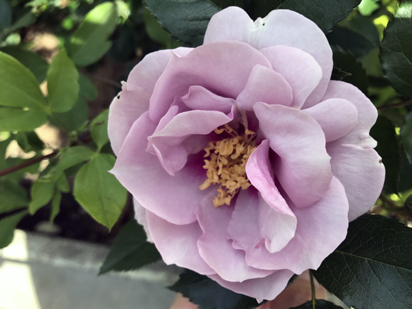 花枝があまり長くないので、葉の間に埋もれるように咲いています。花色は、グレーか藤色がかった微妙なニュアンスのある淡いピンク色。夕方には薄紫色にも見えます。