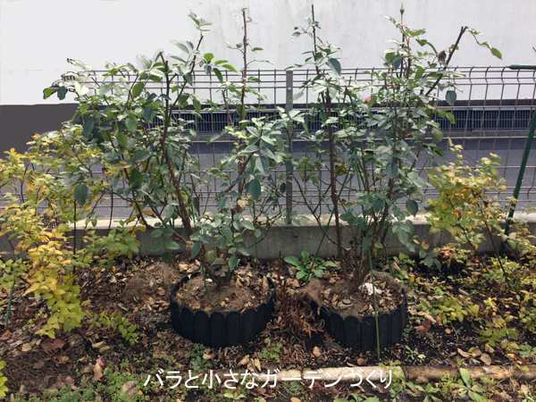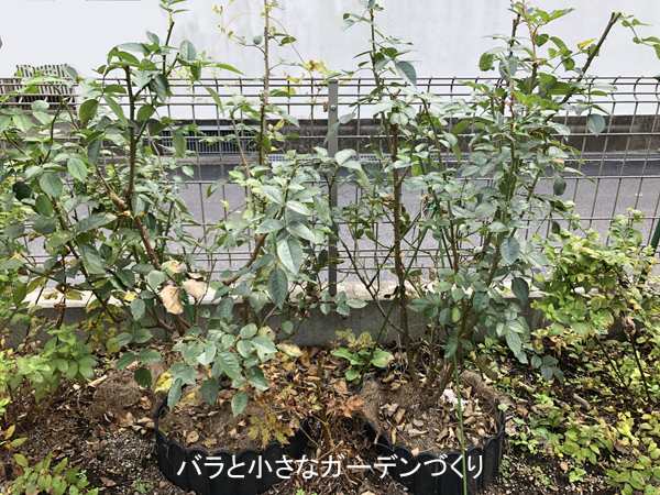 バラは、花の咲いた枝が堅く締まるといわれますが、右の株は花を咲かせられなかったためか、左に比べて枝が細くて柔らかいので、支柱を立てて枝を上向きに矯正しています。樹高は左の株が50cm、右の株が40cmです。