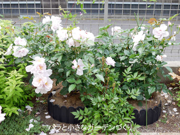 昨年の枝はどれも弱くなり、新しい枝の方が優勢になったので、旧枝は切り取りました。あまり横に広がらない、すっとした樹形でコンパクトな品種なので、弱小枝を切り、フェンスの高さに切りそろえるていどに留めました。