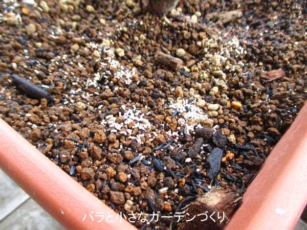 マルチングに使ったのは「赤玉小粒+バーミキュライト+もみ殻燻炭」。有機質の肥料分を含まない清潔な土で、たい肥を含んだ植え込み培養土に蓋をします。