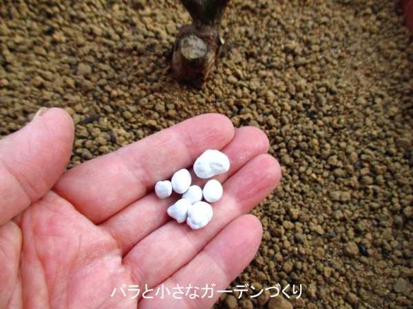 植え込み培養土は緩効性化成肥料(たぶんマグァンプK)の入ったバラの土なので、8号鉢の規定量15粒のところ、半量の7粒を芽出し肥として与えました。芽出し肥として使ったのは緩効性化成肥料の「グリーンそだちIBのチカラ」(花ごころ)です。
