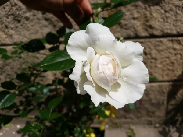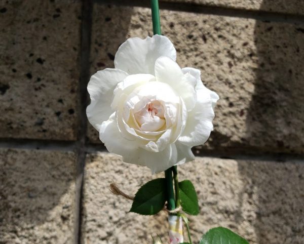 枝が折れそうになり慌ててマスキングテープと支柱で補強したボレロが、無事に咲きました。枝をすぐ固定できたのが良かったのかも知れません!
