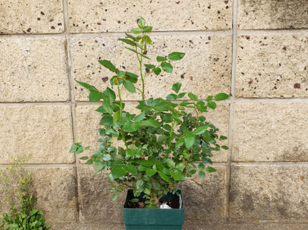 昨年、中苗から育てたボレロが1鉢あります。気に入ったので、今年もう1鉢増やしました。今年の苗は4月にバラの家から届いた大苗です。鉢は、届いたときのままの6号プラ鉢です。