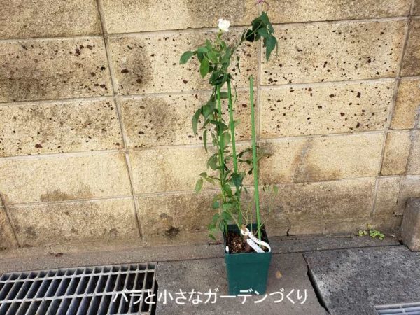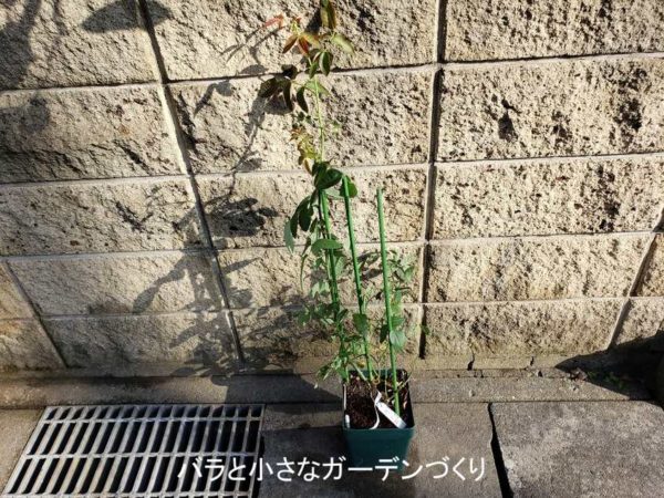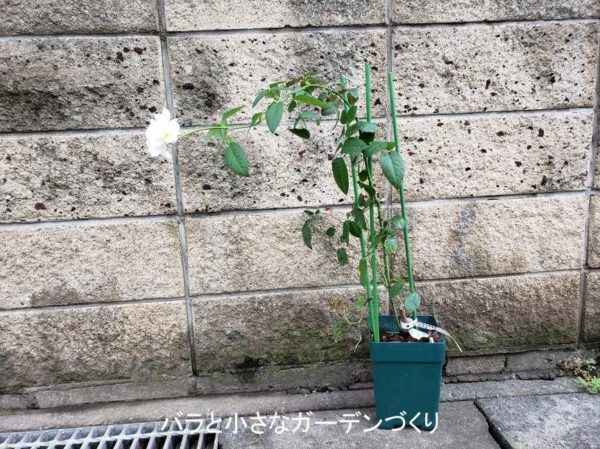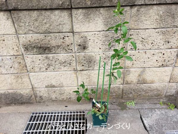花が咲いている枝を伸ばせば株元から90cmほどありますが、枝が細いので花の重みで大きくたわんでいます。来年はもう少し太くなってほしいですね。