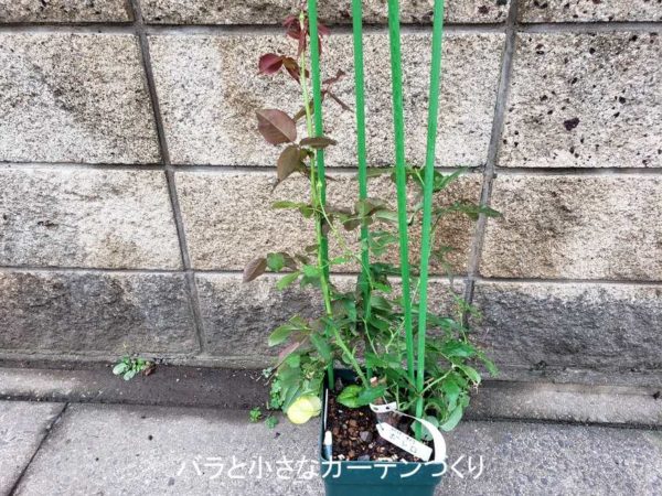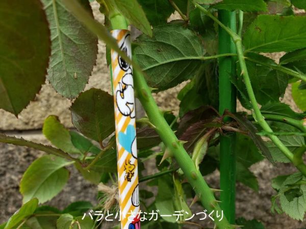 ベイサルシュートを支柱に誘引し、チュウレンジハバチと黒星病対策に、ベニカXファインスプレーをかけました。