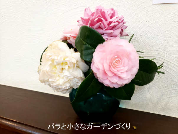 今回咲いた「ボレロ」(写真左)と、今年から育てているバラ「結愛」(写真上)を知り合いの家で飾ってもらいました。まるでバラのようにみえる「乙女椿」(写真右)と、ローズマリー1枝と一緒に、深緑色の花瓶に活けています。