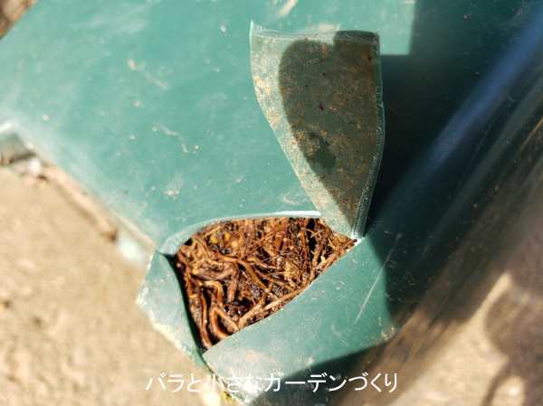 同じ鉢を使い続けているせいか、台風で倒れたときのものか分かりませんが、鉢底近くが割れていました。なかにはぎゅうぎゅう詰めの根が見えています。根詰まりしてそうですが、使える鉢がないので冬の休眠期までこのまま育てようと思います。