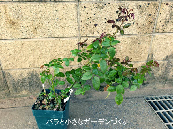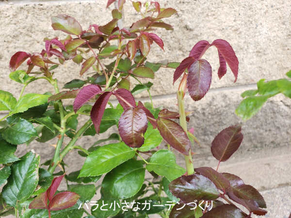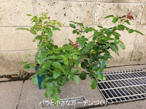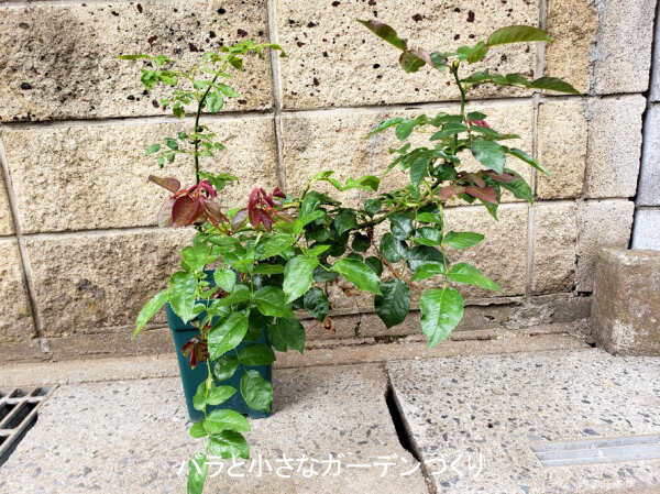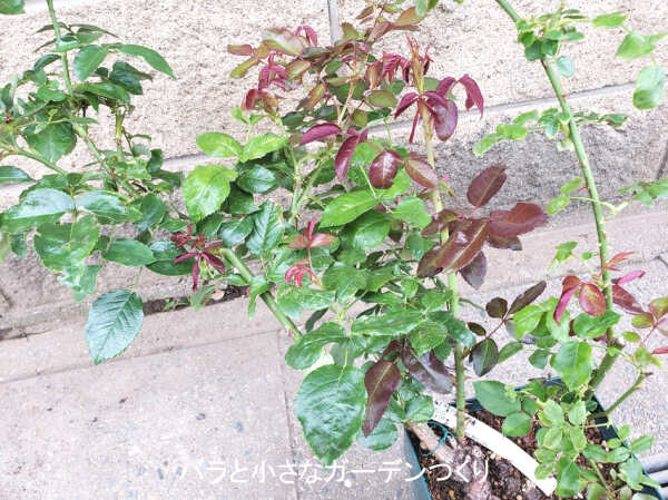 親株はベイサルシュートの他にも赤い新芽が伸びています。挿し木株は、葉は小さいけれど病虫害なしでしっかり育っています。