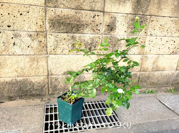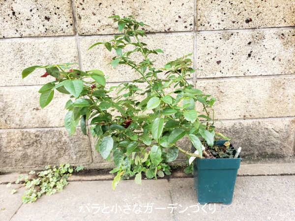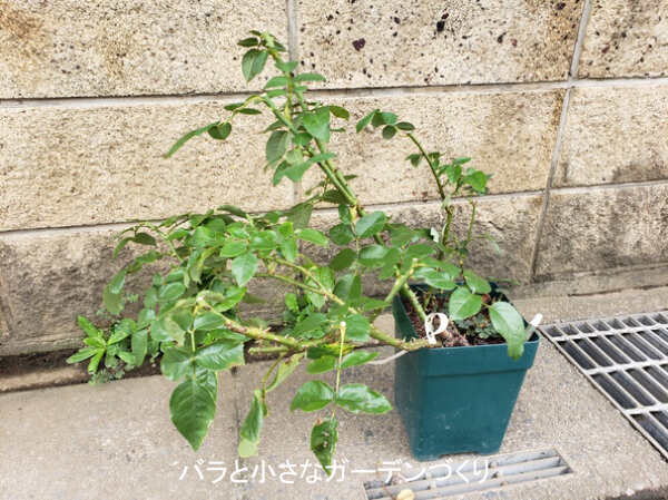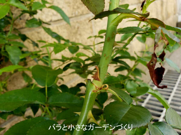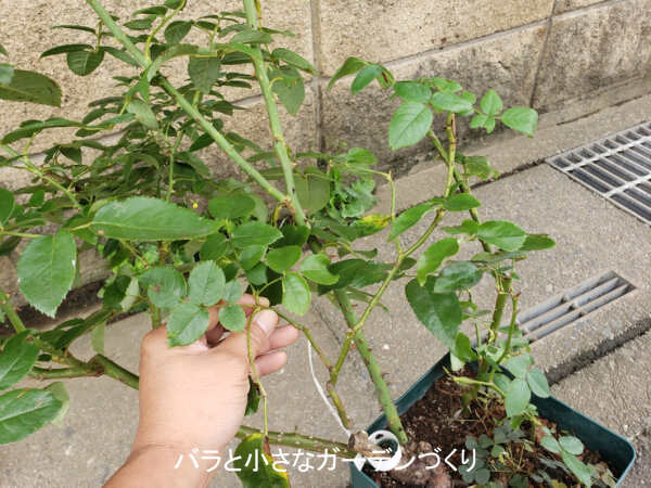 挿し木が成功した2本の枝(左側に立っている枝)の葉が少し黄色く変色しているので、黒星病かな? という感じです。他のバラに黒星病が出ているので、ボレロにも同じ手入れをします。