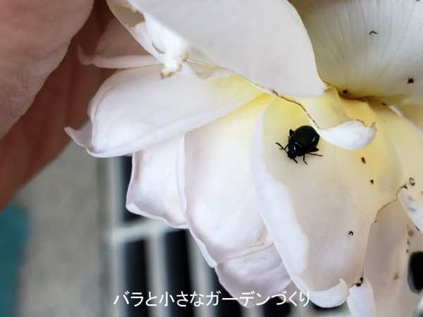 外側の花びらは、小さな黒い甲虫に食べられてしまいました。今年初めて見るタイプの虫です。捕まえようとすると、ピョンと跳んで逃げます。今年は害虫被害がとても多いです。